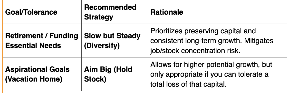 - Recommendation: For most individuals using RSUs to fund essential goals like retirement savings, the disciplined approach of diversification is generally the most prudent and recommended strategy.