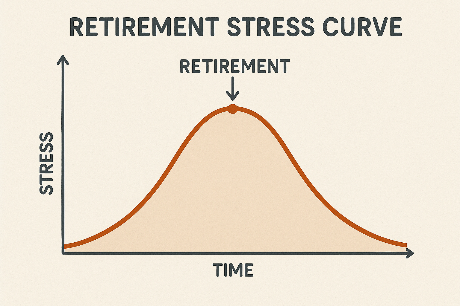 Retirement stress often looks like the chart below. The closer you get to retirement, the more stress you might have. But once you get over the hump and have a solid plan in place, the stress seems to subside as you get more comfortable in this new stage of life.